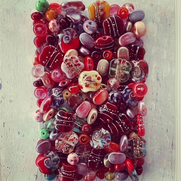 Adding 70 beads to the collection of red beads. Total is now 180 beads made for my @salafestivalexhibition. I like this mix of sparkly silver and gold beads.