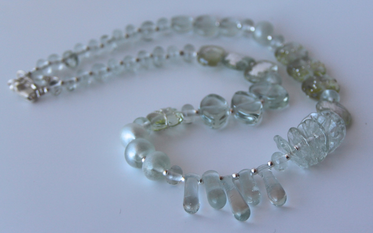 These are some of my favourite necklaces in the exhibition.  I love the length of them, they sit beautifully with a lot of the clothes I am wearing at the moment.  A bit longer than usual, and that’s just perfect.  There are so many great beads in these necklaces, but I tried to stay true to the colour of the bottle, without too much decoration.