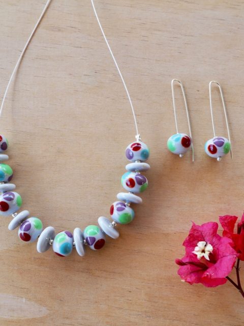 Last week I showed you the rainbow/chakra/colour wheel flower necklace and earrings. This week it’s time to change the pace a little with some transparent pink and green jewellery! I…