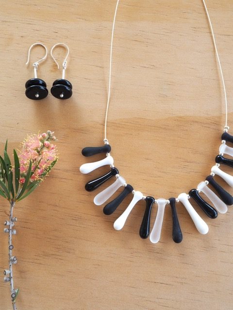 I love the richness of the beads that I have made from a Hendricks Gin bottle. It’s deliciously chocolatey! This necklace is a real pleasure to wear. It’s a statement…