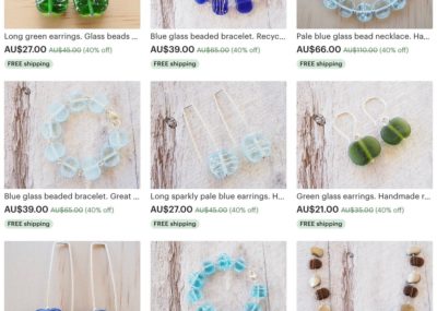 Long earrings featuring beads made from a Hendricks Gin bottle on the left and a…