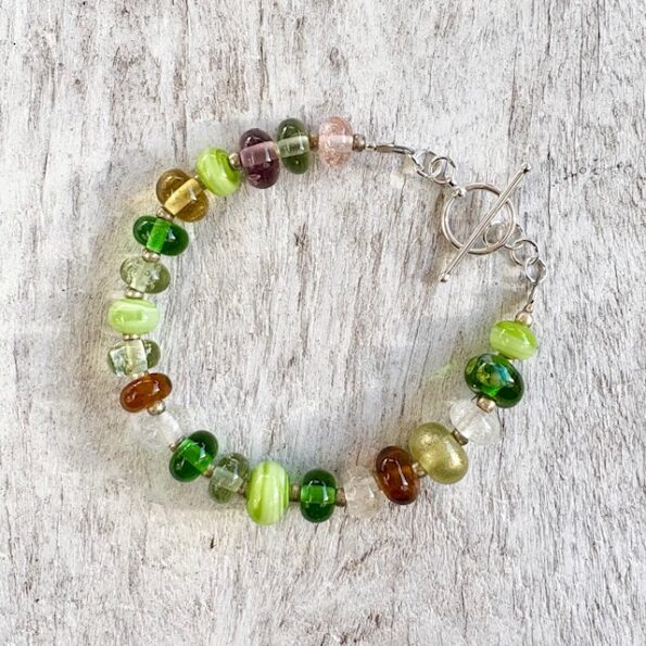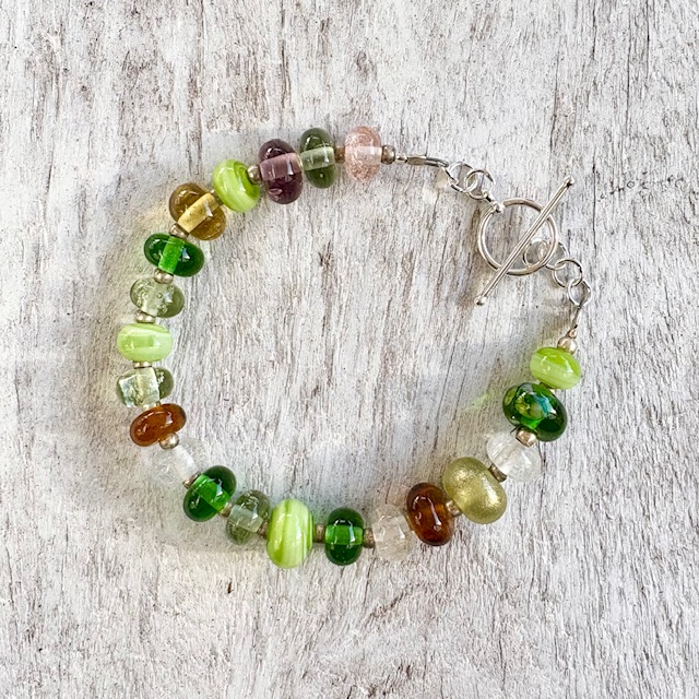 Melted Moments (not quite Monday)! I was looking through all of the little test beads I have been making this year and discovered I had more than enough green ones to make a bracelet. I also added a few other colours for a little pop.