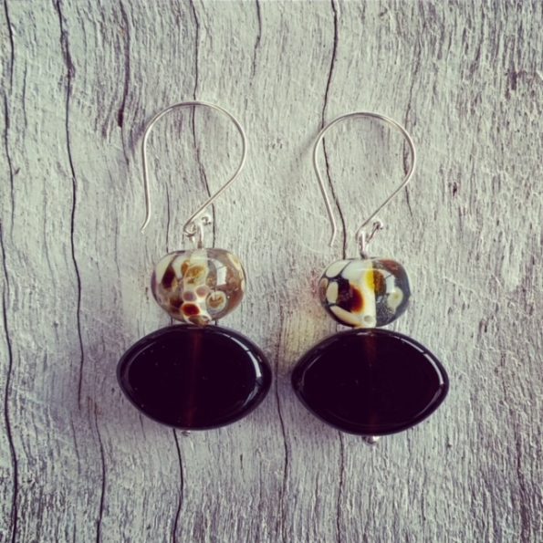 Day 315. Classic Hendricks Gin and Tonic earrings. The Hendricks Gin bottle is so dark it’s almost black, but when I melt the glass to make beads, a dark brown…