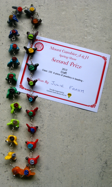 Posted on October 28, 2013 by admin Second Prize I found out on Friday that I won second prize at the Mount Gambier Show in the “A piece of jewellery in beading” section. Thrilled! Here is my piece. It will be for sale in my upcoming exhibition at Ladybeads on the 7th November. Post navigationPrevious post: Earring sale on Etsy!Next post: Getting Ready for “The Rules for Colour are Black and White”
