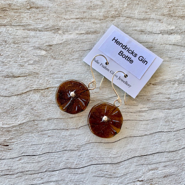 A stunning pair of earrings featuring beads made from a Hendricks Gin bottle.